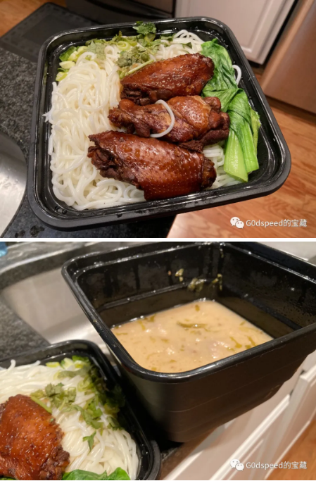 上面的這一盒米線是單加的,如果沒單加米線的話,就只有下面那個盒子。打開以后包裝盒分上下兩層,上層是米線,下層是湯頭。雞翅也是單加的,不知道如果沒加雞翅的話,是不是打開就只有米線。