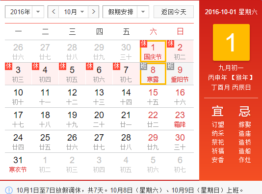 10月1日至7日放假調休,共7天。10月8日(星期六)、10月9日(星期天)上班。